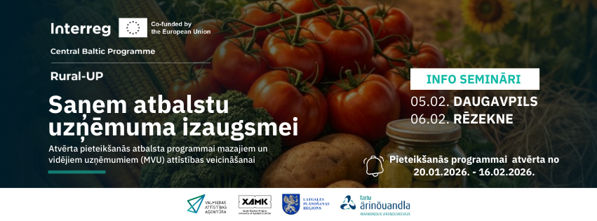 5. februārī Daugavpilī (Saules iela 15, 1. stāvs, LPR biroja telpas) un 6. februārī Rēzeknē (Atbrīvošanas aleja 91, 3. stāvs, LPR biroja telpas), no plkst. 10.00 līdz 13.00, notiks Interreg Centrālās Baltijas projekta “Rural-UP” informatīvie semināri, kuros tiks prezentēta 12 mēnešu atbalsta programma mazajiem un vidējiem uzņēmumiem. Semināri paredzēti pārtikas un bezalkoholisko dzērienu ražotājiem, kā arī saistīto nozaru MVU, sniedzot detalizētu ieskatu programmas piedāvātajās attīstības iespējās un starptautiskās izaugsmes atbalstā.
