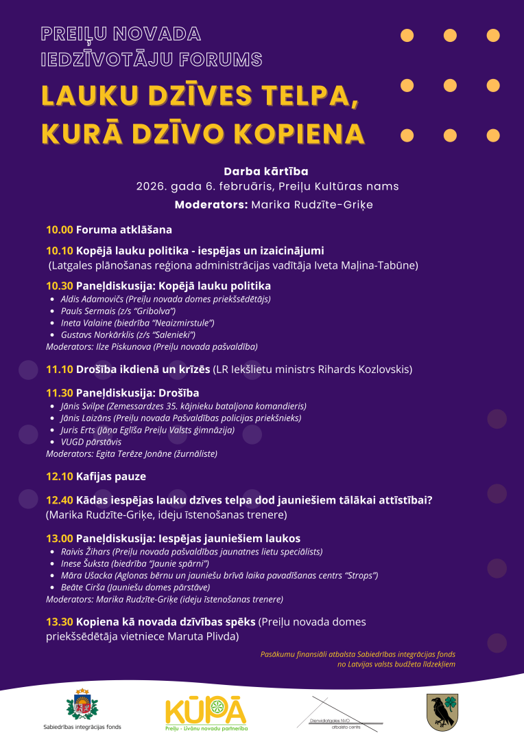 Aicinām uz Preiļu novada iedzīvotāju forumu “Lauku dzīves telpa, kurā dzīvo kopiena”, kas notiks 6. februārī plkst. 10.00 Preiļu Kultūras namā.