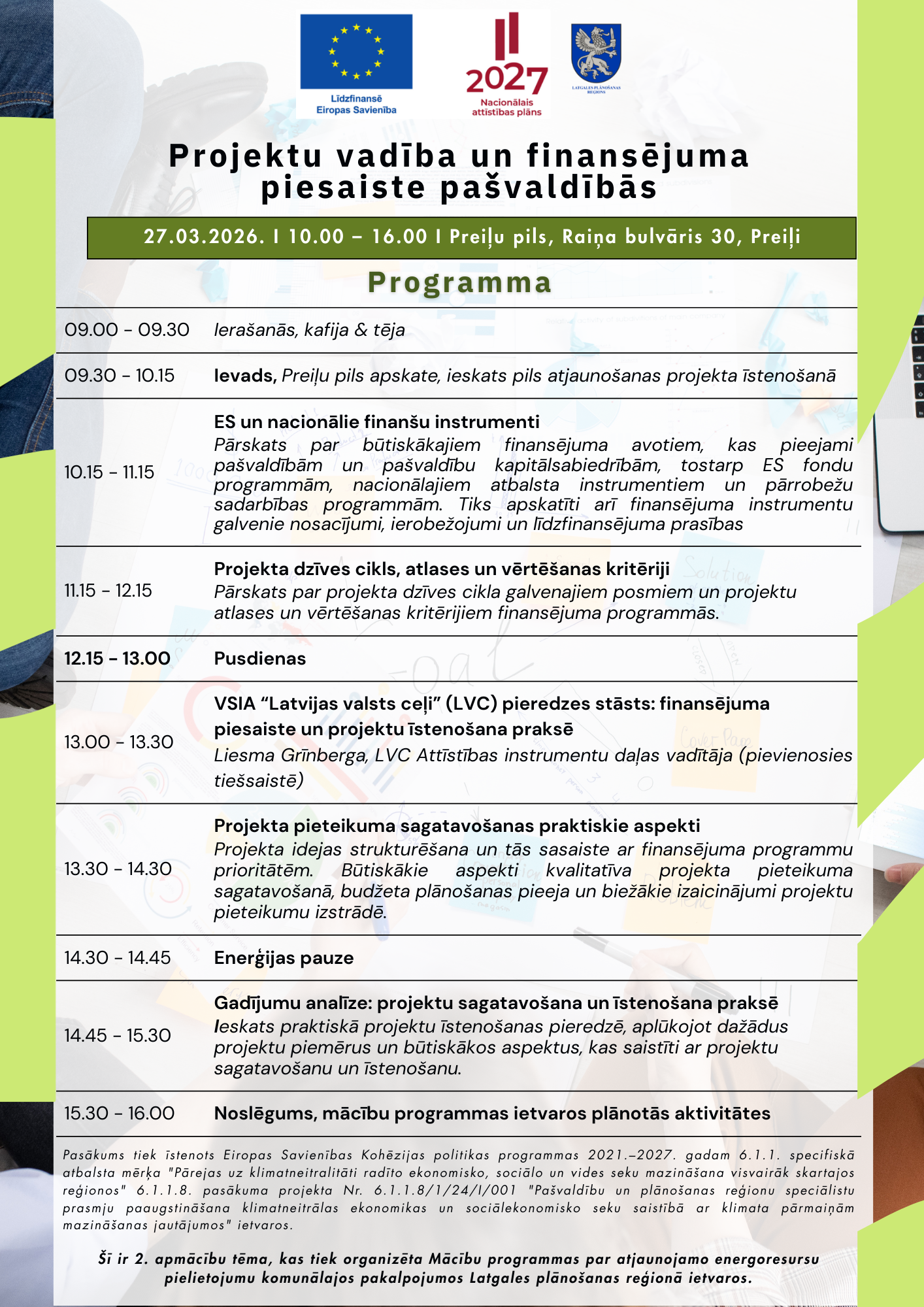 Š.g. 27. martā Latgales plānošanas reģions aicina pašvaldību speciālistus piedalīties praktiskā seminārā par projektu vadību un finansējuma piesaisti pašvaldībās, kas tiek organizēts projekta Nr.6.1.1.8/1/24/I/001 “Pašvaldību un plānošanas reģionu speciālistu prasmju paaugstināšana klimatneitrālas ekonomikas un sociālekonomisko seku saistībā ar klimata pārmaiņām mazināšanas jautājumos” Mācību programmas par atjaunojamo energoresursu pielietojumu komunālajos pakalpojumos Latgales plānošanas reģionā ietvaros.