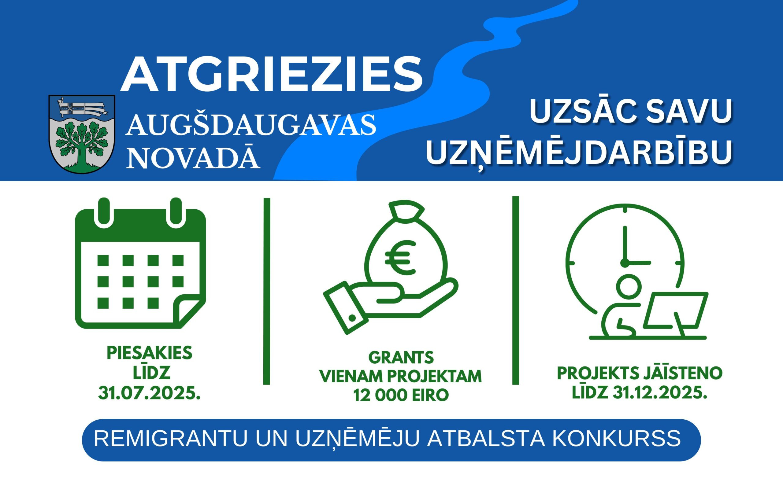 Augšdaugavas novada pašvaldība izsludina grantu konkursu uzņēmējdarbībai “Remigrācijas atbalsta pasākums – uzņēmējdarbības atbalsts” projektiem Augšdaugavas novada teritorijā.